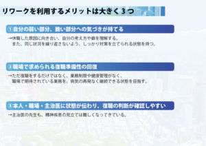 「不調の原因は人それぞれであり、一人ひとりに寄り添った丁寧な取り組みが必要なのでリワークの仕組みが必要だとあらためて理解できました」