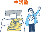 生活塾では、あらゆる活動の土台となる日常の管理や生活習慣を整え(生活面の準備)、様々な社会の中で活動するために必要な様々な対人スキル、認知・感情の管理方法(社会面の準備)を身に付けていきます。